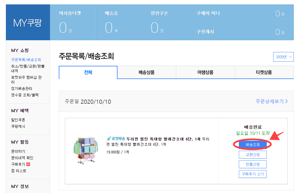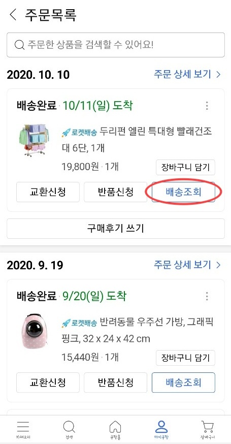 주문목록에 들어가시면 쿠팡에서 주문한 목록이뜨고 배송조회를 원하시는 상품의 배송조회를 눌러주시면 쿠팡배송조회가 자세하게 나옵니다.