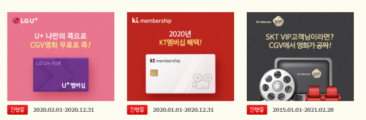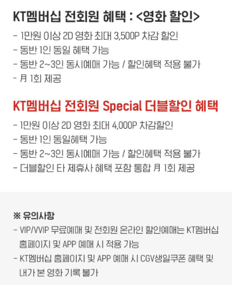 무려 대표통신사 3사 전부 할인과 무료혜택이 있는데요. LGU+통신사를 사용하시는 분들중 나만의 콕혜택을 영화로 설정하신 멤버쉽 VIP이상이신 회원들은 월 1회, 연12회 영화를 무료관람 하실 수있습니다. KT통신사를 사용하시는 분들은 VIP 본인 무료혜택과 동반 1인 최대 3500P차감할인이 가능하며, 월 1회 년6회 제공됩니다.