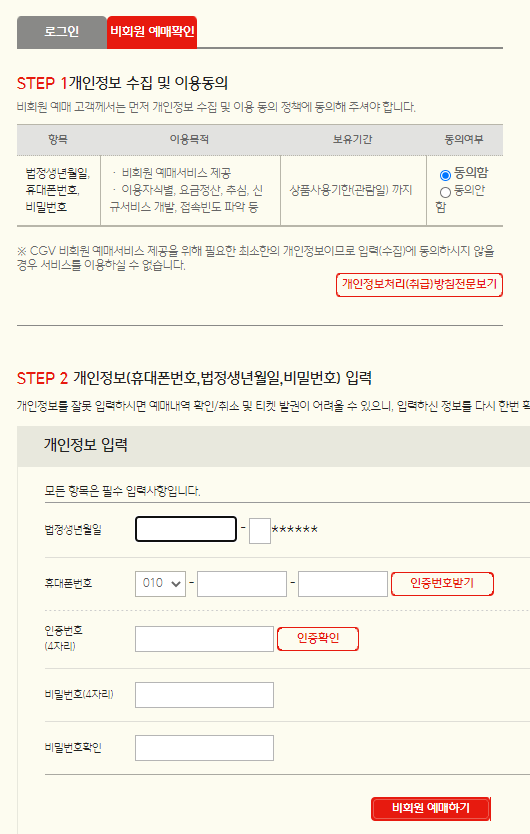 좌석선택을 클릭하시면 cgv회원 로그인을 해달라고하는데요. 회원이 아니시면 아래의 비회원 예매를 클릭하셔서 개인정보 수집및 이용의 동의를 해주시고 휴데폰번호 인증을 하신 후 비회원예매하기를 하시면 됩니다. 회원가입을 하시고 이용하시면 다양한 혜택과 cjone 포인트 적립도 가능하시니 가입을하고 이용하는 것도 좋습니다.
