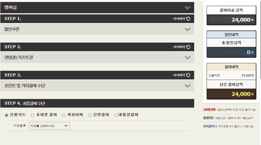 저는 로그인한 결제화면 입니다. 할인쿠폰이 있으시면 할인쿠폰을 사용하시고 관람권선택, 포인트가 있으시면 포인트사용을 하시고 원하시는 최종 결제수단을 클릭하여 오른쪽아래의 결제하기를 눌러 결제를 완료해주시면 됩니다.