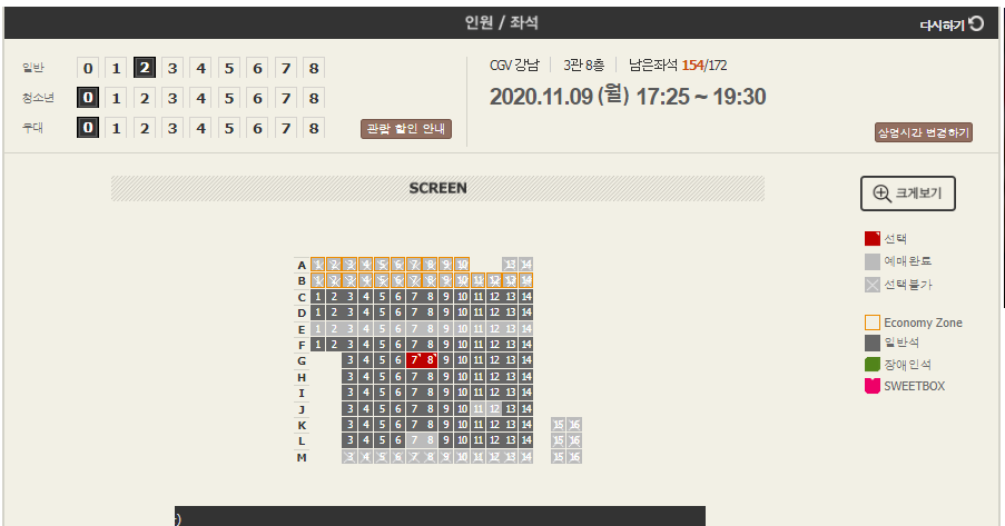 로그인을 완료하시고 좌석선택을 눌러 왼쪽위쪽에 있는 인원선택을 해주시고 좌석을 선택하신 후 오른쪽아래에 결제 선택을 클릭해 주세요. 극장이용시 마스크착용은 필수입니다.