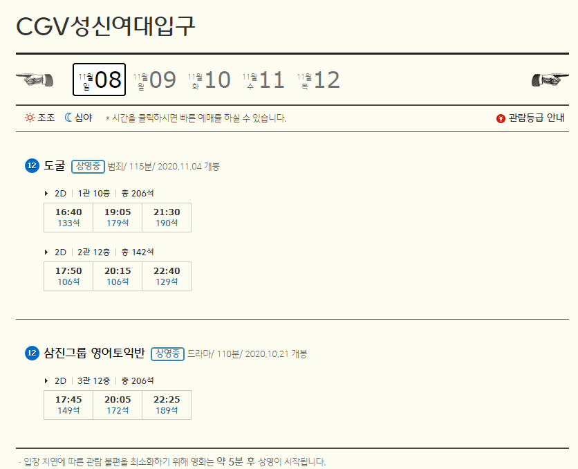 원하는 극장을 클릭하시고 아래고 내리시면 그 극장의 상영시간표가 나옵니다. 저는 cgv성신여대입구점을 클릭해봤더니 오늘은 도굴과 삼진그룹 영어토익반밖에 상영을 하지 않는걸 확인할 수있었습니다.