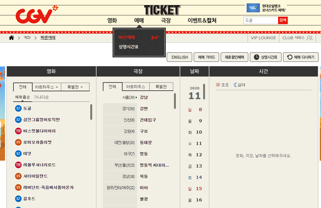 위에와 같이 예매를 누르시고 상영시간표가 아닌 빠른예매를 클릭해 주세요.