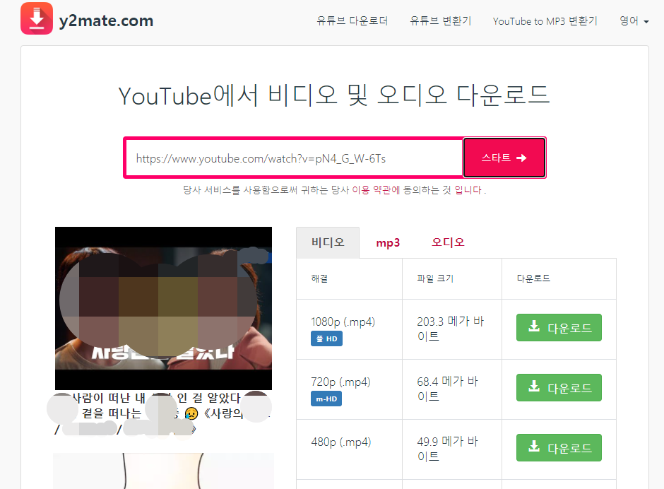 그럼 내가 원하는 동영상을 다운로드 할 수있는 홈페이지로 접속됩니다. 해상도와 파일크기를 확인하시고 원하시는 걸로 다운로드를 눌러 다운로드 받아주시면 됩니다. mp3로 다운로드 받으실 분은 mp3를 클릭하여 다운로드 받아 주시면 되겠습니다.