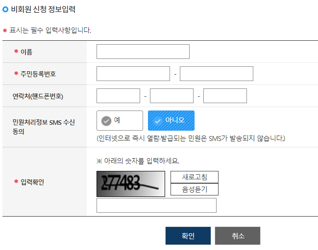 비회원 신청하기를 누르신 후 약관에 동의를 해주시고 이름과 주민등록번호, 입력확인을 작성해 주신 후 확인 버튼을 눌러 발급 신청을 하시면 됩니다. 비회원으로 로그인을 하시더라도 대학교졸업증명서 발급신청을 위해선 공인인증서가 필요하니 미리 준비해 주세요.
