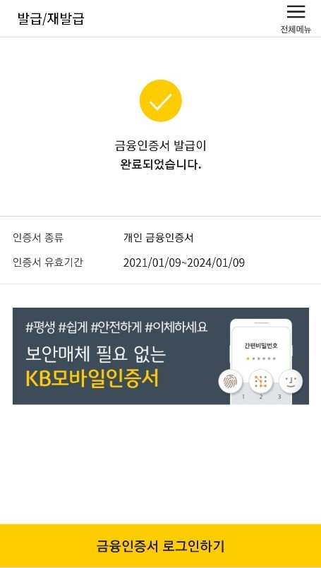 정보를 다 입력하신 후 확인을 누르시면 금융인증서의 비밀번호 6자리를 설정하라고 나오고 비밀번호를 다 설정 했으면 금융인증서 발급이 완료 됩니다. 제가 발급받은 KB모바일 인증서로 공공기관 서비스도 이용이 가능하다고 합니다.