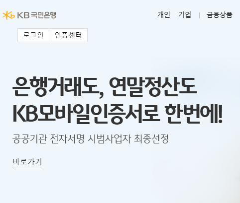 컴퓨터로 금융인증서 발급을 받기 위해서는 자신이 이용하는 은행중 원하는 은행의 홈페이지에 접속해 주셔야 됩니다. 저는 주로 사용하는 국민은행은 검색한 후 국민은행 홈페이지에서 금융인증서 발급을 받았습니다. 국민은행 홈페이지에 접속하셨으면 왼쪽상단에 로그인이나 인증센터를 클릭하신 후 금융인증서 발급/재발급을 찾아 클릭해 주세요.