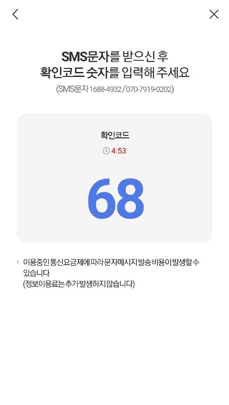 그 후 고객정보를 확인하시고 SMS문자를 받고 휴대폰 화면에 나오는 숫자를 답장으로 보내시면 금융인증 서비스를 시작합니다가 나오고 이름과 휴대폰번호, 생년월일을 입력하신 다음 확인을 눌러주세요.