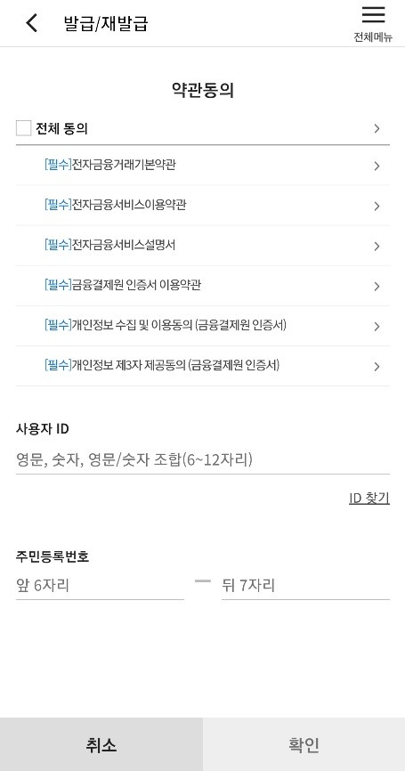 국민은행에서 발급을 받기 위해서는 국민은행 아이디와 주민등록번호가 필요합니다. 약관 및 서비스 설명서를 읽으시고 전체동의 후 사용자 아이디와 주민등록 번호를 누르시고 확인을 누르시면 추가 본인인증을 통해 한번더 인증을 해주셔야 됩니다. 아이디가 없으시면 회원가입을, 아이디를 까먹으셨으면 ID조회를 눌러 아이디를 찾아 주시면 됩니다.