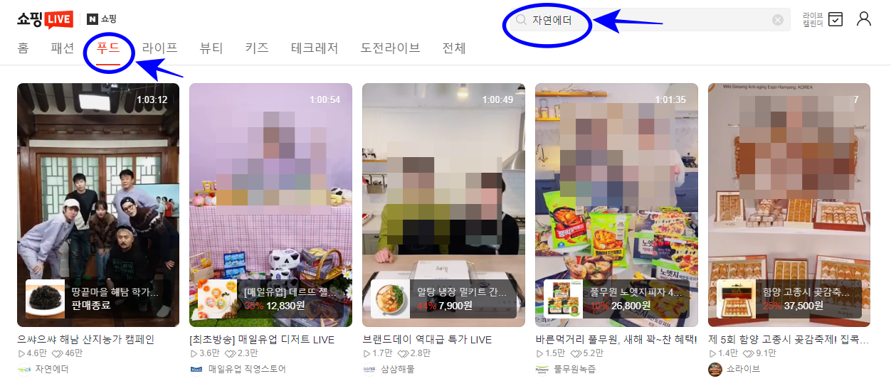 라이브쇼핑 홈페이지에 접속하셔서 위쪽에 푸드를 선택하시거나 검색창에 자연에더를 검색하시면 맛남의 광장 라이브 쇼핑을 만나보실 수있습니다. 아니면 아래의 바로가기를 이용하셔서 접속해 주셔도 편리합니다.