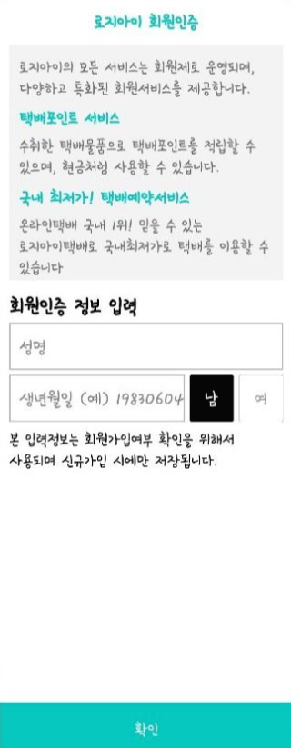 앱을 다운받으시면 로지아이 회원등록이 되어있으신 분은 회원인증을 통해 로그인해주시면되고, 없으신 분은 회원가입 해주시면됩니다.