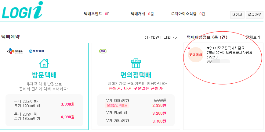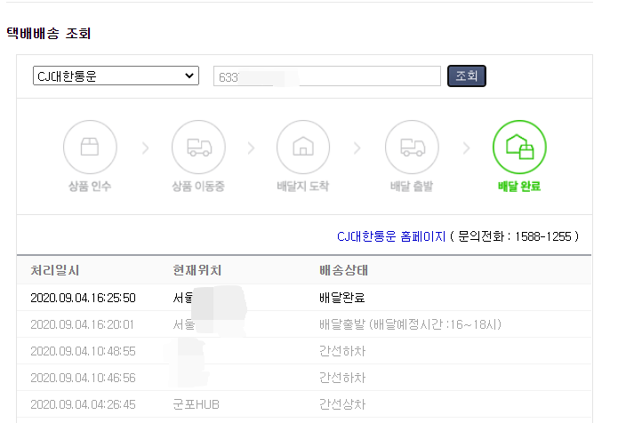 회원이 아니시면 회원가입 후에 로그인을 하면 오른쪽 위 택배배송정보에 내가 주문한 택배가 뜹니다. 원하는 택배를 클릭하시면 택배의 위치를 알 수도있습니다. 간단하게 로그인만 하면 내 택배가 조회되는 좋은 사이트 인거 같네요.