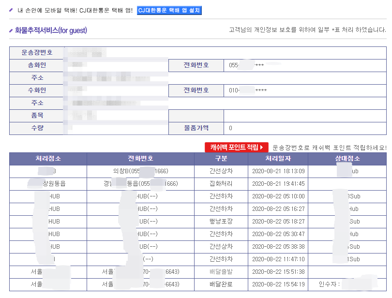 cj대한통운 택배 상세조회 운송장번호 모를때