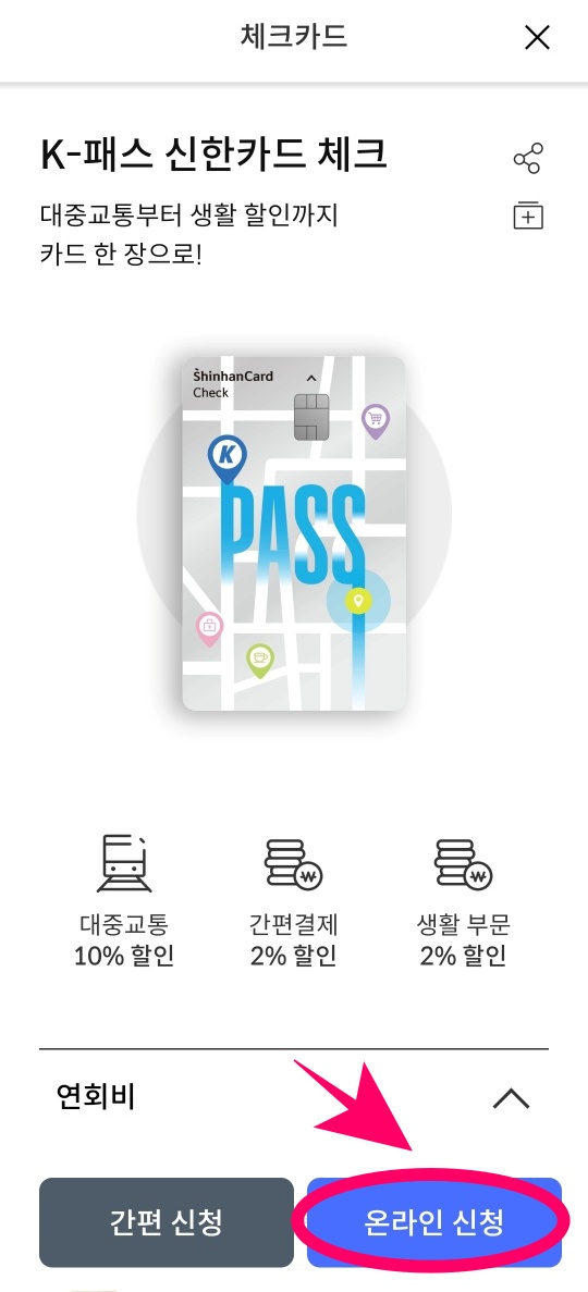 간편하게 사용하는 은행 카드앱에 들어가서 k패스를 검색하시면 체크카드와 신용카드중 원하는 카드로 온라인 발급 신청을 하실 수있습니다 초반에는 카드 배송오는데까지 2주정도 소요 되었는데 요즘엔 그보다 더 빨리 도착할 수도있습니다.